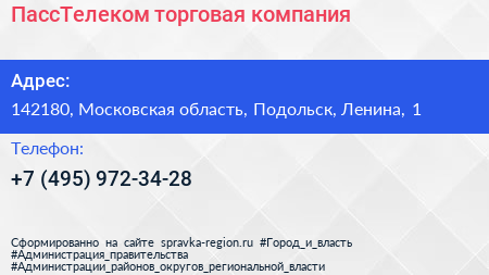 ПассТелеком, торговая компания по адресу 142180, Московская область, Подольск, Ленина, 1 в дальнейшем Организация, размещена в следующих категориях: