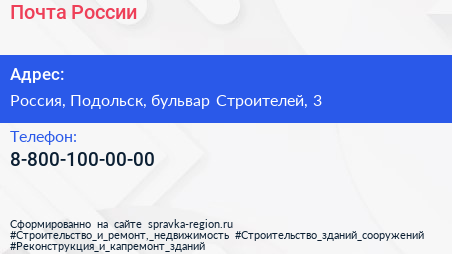 Почта России по адресу 3, бульвар Строителей, Жилой квартал «Домодедово парк», Домодедово, городской округ Домодедово, Московская область, Центральный федеральный округ, 142029, Россия в дальнейшем Организация, размещена в следующих категориях:
