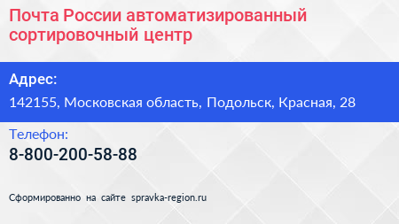 Почта России, автоматизированный сортировочный центр по адресу 142155, Московская область, Подольск, Красная, 28 в дальнейшем Организация, размещена в следующих категориях: