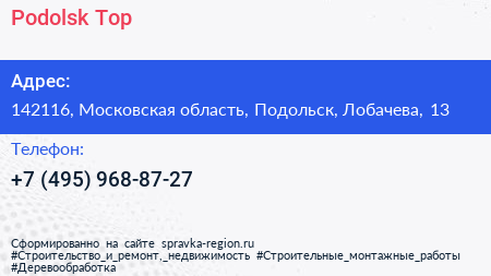 Podolsk.Top по адресу 142116, Московская область, Подольск, Лобачева, 13 в дальнейшем Организация, размещена в следующих категориях: