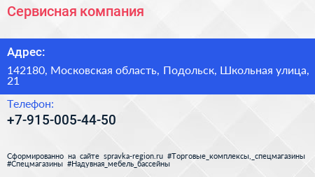 Сервисная компания по адресу 142180, Московская область, Подольск, Школьная улица, 21 в дальнейшем Организация, размещена в следующих категориях: