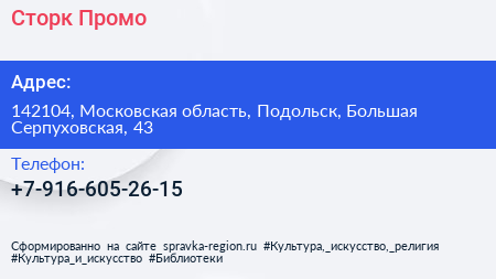Сторк Промо по адресу 142104, Московская область, Подольск, Большая Серпуховская, 43 в дальнейшем Организация, размещена в следующих категориях: