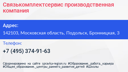 Связькомплектсервис, производственная компания по адресу 142103, Московская область, Подольск, Бронницкая, 3 в дальнейшем Организация, размещена в следующих категориях: