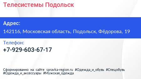 Телесистемы Подольск по адресу 142116, Московская область, Подольск, Фёдорова, 19 в дальнейшем Организация, размещена в следующих категориях: