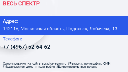 ВЕСЬ СПЕКТР по адресу 142116, Московская область, Подольск, Лобачева, 13 в дальнейшем Организация, размещена в следующих категориях: