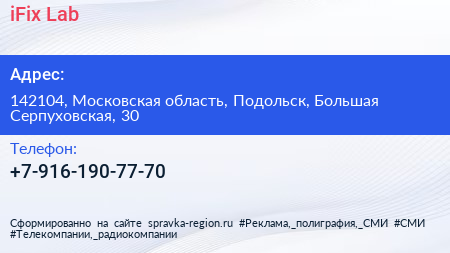 iFix-Lab по адресу 142104, Московская область, Подольск, Большая Серпуховская, 30 в дальнейшем Организация, размещена в следующих категориях: