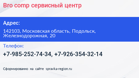 Bro-comp, сервисный центр по адресу 142103, Московская область, Подольск, Железнодорожная, 20 в дальнейшем Организация, размещена в следующих категориях: