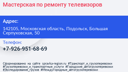 Мастерская по ремонту телевизоров по адресу 142105, Московская область, Подольск, Большая Серпуховская, 50 в дальнейшем Организация, размещена в следующих категориях: