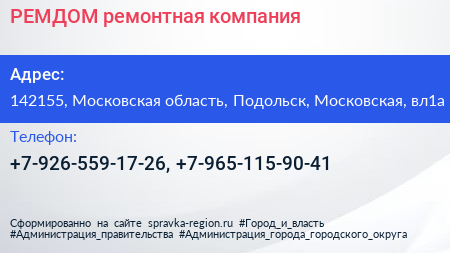 РЕМДОМ, ремонтная компания по адресу 142155, Московская область, Подольск, Московская, вл1а в дальнейшем Организация, размещена в следующих категориях: