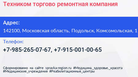 Техником, торгово-ремонтная компания по адресу 142100, Московская область, Подольск, Комсомольская, 1 в дальнейшем Организация, размещена в следующих категориях: