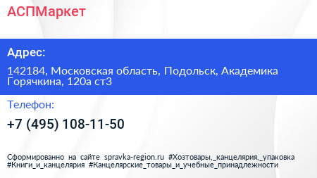АСПМаркет по адресу 142184, Московская область, Подольск, Академика Горячкина, 120а ст3 в дальнейшем Организация, размещена в следующих категориях: