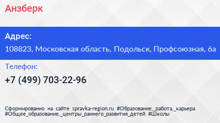 Анзберк по адресу 108823, Московская область, Подольск, Профсоюзная, 6а в дальнейшем Организация, размещена в следующих категориях: