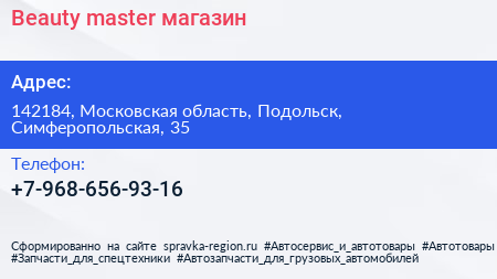 Beauty master, магазин по адресу 142184, Московская область, Подольск, Симферопольская, 35 в дальнейшем Организация, размещена в следующих категориях: