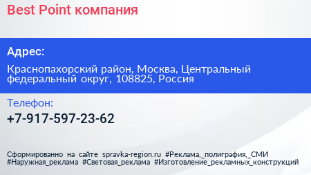 Best Point, компания по адресу Краснопахорский район, Москва, Центральный федеральный округ, 108825, Россия в дальнейшем Организация, размещена в следующих категориях: