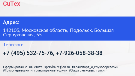CuTex по адресу 142105, Московская область, Подольск, Большая Серпуховская, 55 в дальнейшем Организация, размещена в следующих категориях: