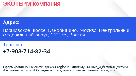 ЭКОТЕРМ, компания по адресу Варшавское шоссе, Ознобишино, Москва, Центральный федеральный округ, 142145, Россия в дальнейшем Организация, размещена в следующих категориях: