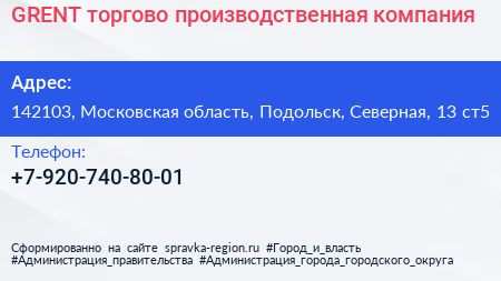 GRENT, торгово-производственная компания по адресу 142103, Московская область, Подольск, Северная, 13 ст5 в дальнейшем Организация, размещена в следующих категориях: