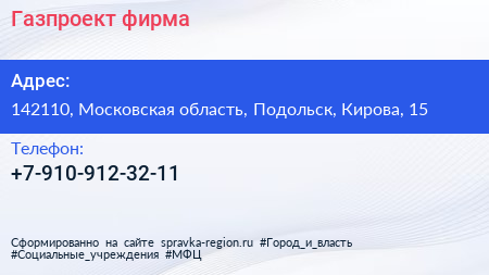 Газпроект, фирма по адресу 142110, Московская область, Подольск, Кирова, 15 в дальнейшем Организация, размещена в следующих категориях: