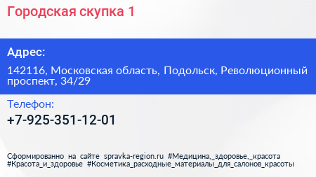 Городская скупка №1 по адресу 142116, Московская область, Подольск, Революционный проспект, 34/29 в дальнейшем Организация, размещена в следующих категориях: