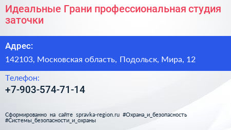 Идеальные Грани, профессиональная студия заточки по адресу 142103, Московская область, Подольск, Мира, 12 в дальнейшем Организация, размещена в следующих категориях: