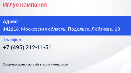 Иглус, компания по адресу 142116, Московская область, Подольск, Лобачева, 13 в дальнейшем Организация, размещена в следующих категориях: