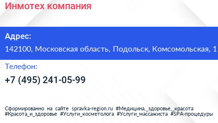 Инмотех, компания по адресу 142100, Московская область, Подольск, Комсомольская, 1 в дальнейшем Организация, размещена в следующих категориях: