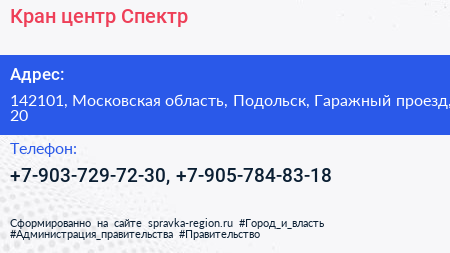 Кран-центр Спектр по адресу 142101, Московская область, Подольск, Гаражный проезд, 20 в дальнейшем Организация, размещена в следующих категориях: