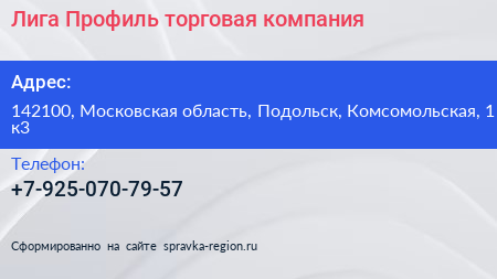 Лига Профиль, торговая компания по адресу 142100, Московская область, Подольск, Комсомольская, 1 к3 в дальнейшем Организация, размещена в следующих категориях: