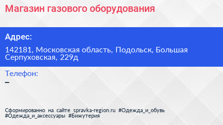 Магазин газового оборудования по адресу 142181, Московская область, Подольск, Большая Серпуховская, 229д в дальнейшем Организация, размещена в следующих категориях: