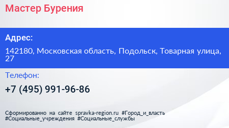Мастер Бурения по адресу 142180, Московская область, Подольск, Товарная улица, 27 в дальнейшем Организация, размещена в следующих категориях: