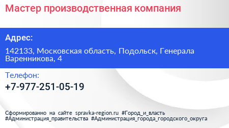 Мастер, производственная компания по адресу 142133, Московская область, Подольск, Генерала Варенникова, 4 в дальнейшем Организация, размещена в следующих категориях:
