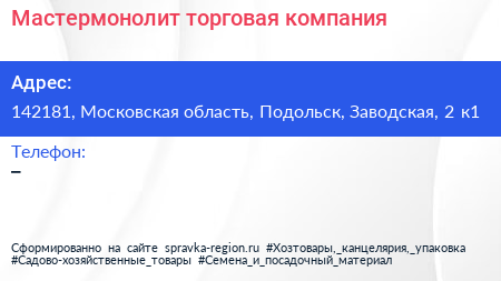Мастермонолит, торговая компания по адресу 142181, Московская область, Подольск, Заводская, 2 к1 в дальнейшем Организация, размещена в следующих категориях: