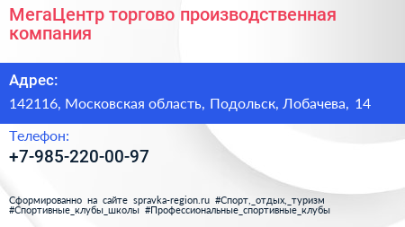 МегаЦентр, торгово-производственная компания по адресу 142116, Московская область, Подольск, Лобачева, 14 в дальнейшем Организация, размещена в следующих категориях: