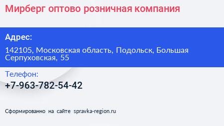 Мирберг, оптово-розничная компания по адресу 142105, Московская область, Подольск, Большая Серпуховская, 55 в дальнейшем Организация, размещена в следующих категориях: