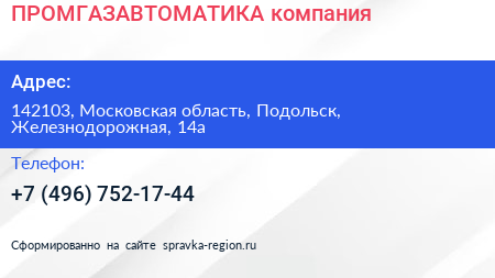 ПРОМГАЗАВТОМАТИКА, компания по адресу 142103, Московская область, Подольск, Железнодорожная, 14а в дальнейшем Организация, размещена в следующих категориях: