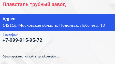 Плавсталь, трубный завод по адресу 142116, Московская область, Подольск, Лобачева, 13 в дальнейшем Организация, размещена в следующих категориях: