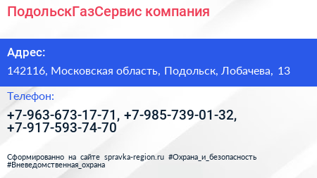ПодольскГазСервис, компания по адресу 142116, Московская область, Подольск, Лобачева, 13 в дальнейшем Организация, размещена в следующих категориях:
