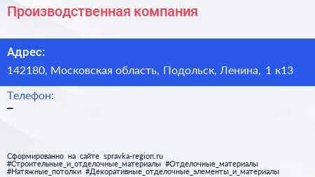 Производственная компания по адресу 142180, Московская область, Подольск, Ленина, 1 к13 в дальнейшем Организация, размещена в следующих категориях: