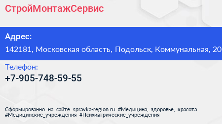 СтройМонтажСервис по адресу 142181, Московская область, Подольск, Коммунальная, 20 в дальнейшем Организация, размещена в следующих категориях: