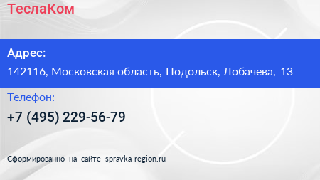 ТеслаКом по адресу 142116, Московская область, Подольск, Лобачева, 13 в дальнейшем Организация, размещена в следующих категориях: