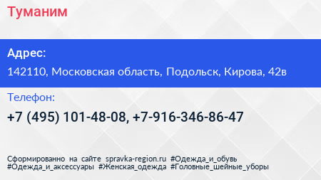 Туманим по адресу 142110, Московская область, Подольск, Кирова, 42в в дальнейшем Организация, размещена в следующих категориях: