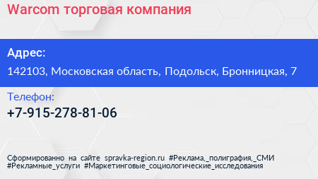 Warcom, торговая компания по адресу 142103, Московская область, Подольск, Бронницкая, 7 в дальнейшем Организация, размещена в следующих категориях: