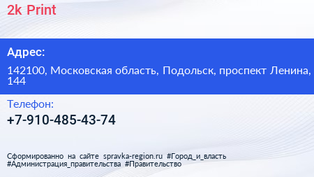 2k Print по адресу 142100, Московская область, Подольск, проспект Ленина, 144 в дальнейшем Организация, размещена в следующих категориях: