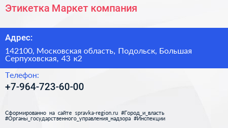 Этикетка Маркет, компания по адресу 142100, Московская область, Подольск, Большая Серпуховская, 43 к2 в дальнейшем Организация, размещена в следующих категориях: