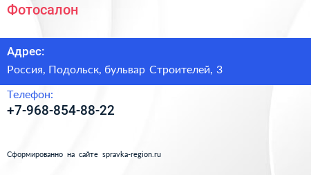 Фотосалон по адресу 3, бульвар Строителей, Жилой квартал «Домодедово парк», Домодедово, городской округ Домодедово, Московская область, Центральный федеральный округ, 142029, Россия в дальнейшем Организация, размещена в следующих категориях: