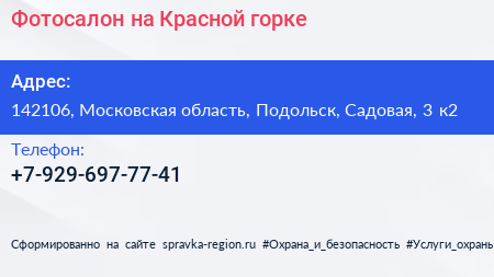 Фотосалон на Красной горке по адресу 142106, Московская область, Подольск, Садовая, 3 к2 в дальнейшем Организация, размещена в следующих категориях: