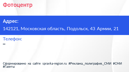 Фотоцентр по адресу 142121, Московская область, Подольск, 43 Армии, 21 в дальнейшем Организация, размещена в следующих категориях: