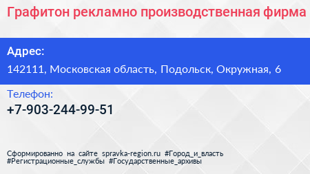 Графитон, рекламно-производственная фирма по адресу 142111, Московская область, Подольск, Окружная, 6 в дальнейшем Организация, размещена в следующих категориях: