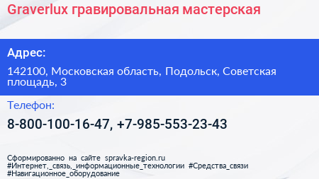 Graverlux, гравировальная мастерская по адресу 142100, Московская область, Подольск, Советская площадь, 3 в дальнейшем Организация, размещена в следующих категориях:
