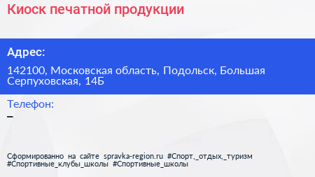 Киоск печатной продукции по адресу 142100, Московская область, Подольск, Большая Серпуховская, 14Б в дальнейшем Организация, размещена в следующих категориях: